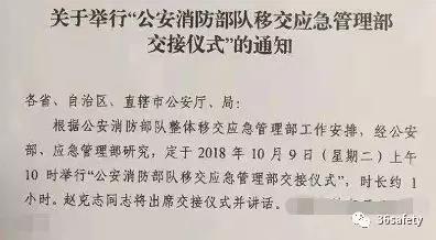 據(jù)多家媒體披露,根據(jù)公安消防部隊(duì)整體移交應(yīng)急管理部工作安排,經(jīng)應(yīng)急管理部、公安部部門研究,定于2018年10月9日(周二)上午10時(shí)舉行“公安消防部隊(duì)移交應(yīng)急管理部交接儀式”,時(shí)長約1小時(shí),公安部部長趙克志將出席交接儀式并講話,主會(huì)場設(shè)在公安部機(jī)關(guān)樓。